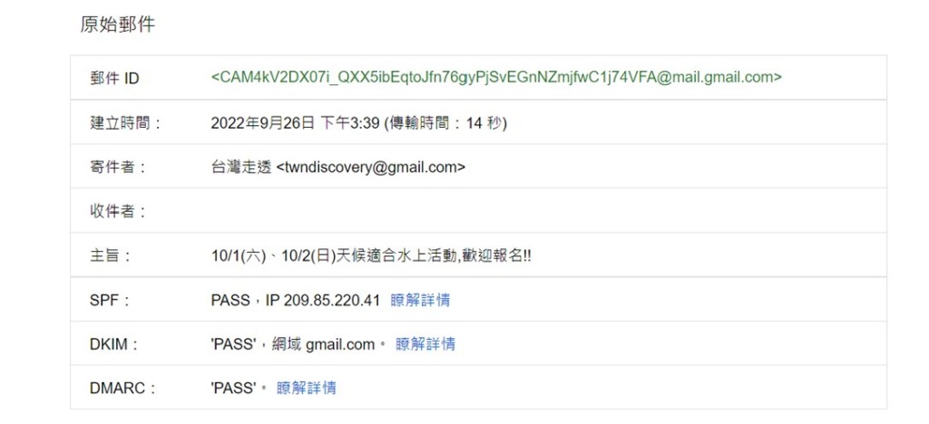 - 看原始郵件內容,查看 DMARC的欄位是否為“PASS”。