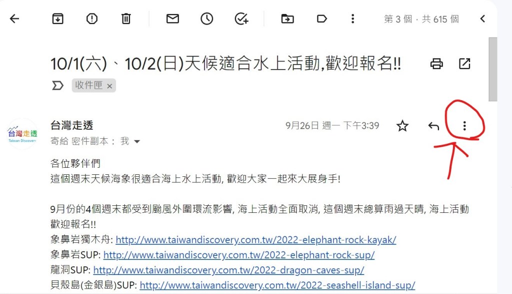 - 點開寄到Gmail信箱的信件,並按點擊如下圖中右上角的三個小點按鈕,找到“顯示原始郵件”的按鈕並點擊。