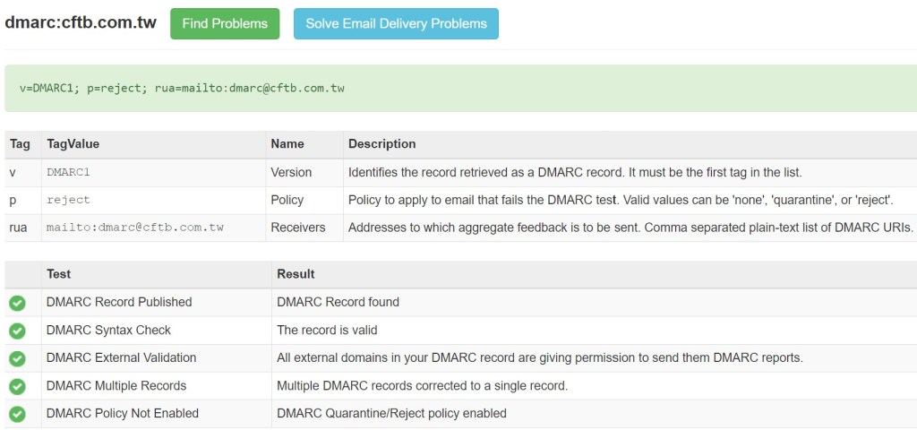 - 顯示檢測結果,如果都是綠色打勾的話,代表DMARC檢測是OK的喔!