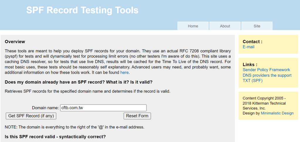 設定完成後可以檢測一下SPF設定是否正確,可以利用下列這二個免費的網站來做檢測喔!
