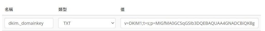 接下來就把 DKIM的公鑰設定值填到 DNS Server上的設定中,設定類型請選 TXT,名稱的部份請填 dkim._domainkey,值的部份請填要設定的DKIM值,下列是範例。