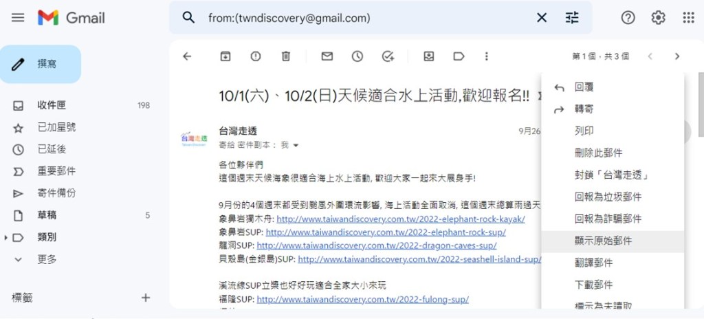 - 點開寄到Gmail信箱的信件,並按點擊如下圖中右上角的三個小點按鈕,找到“顯示原始郵件”的按鈕並點擊。