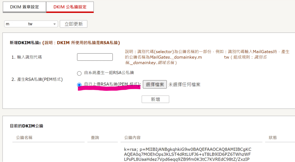 這邊我用網擎的MailGates為例做,即可把剛才步驟一產生的私鑰(Private Key)存成文字檔後上傳。